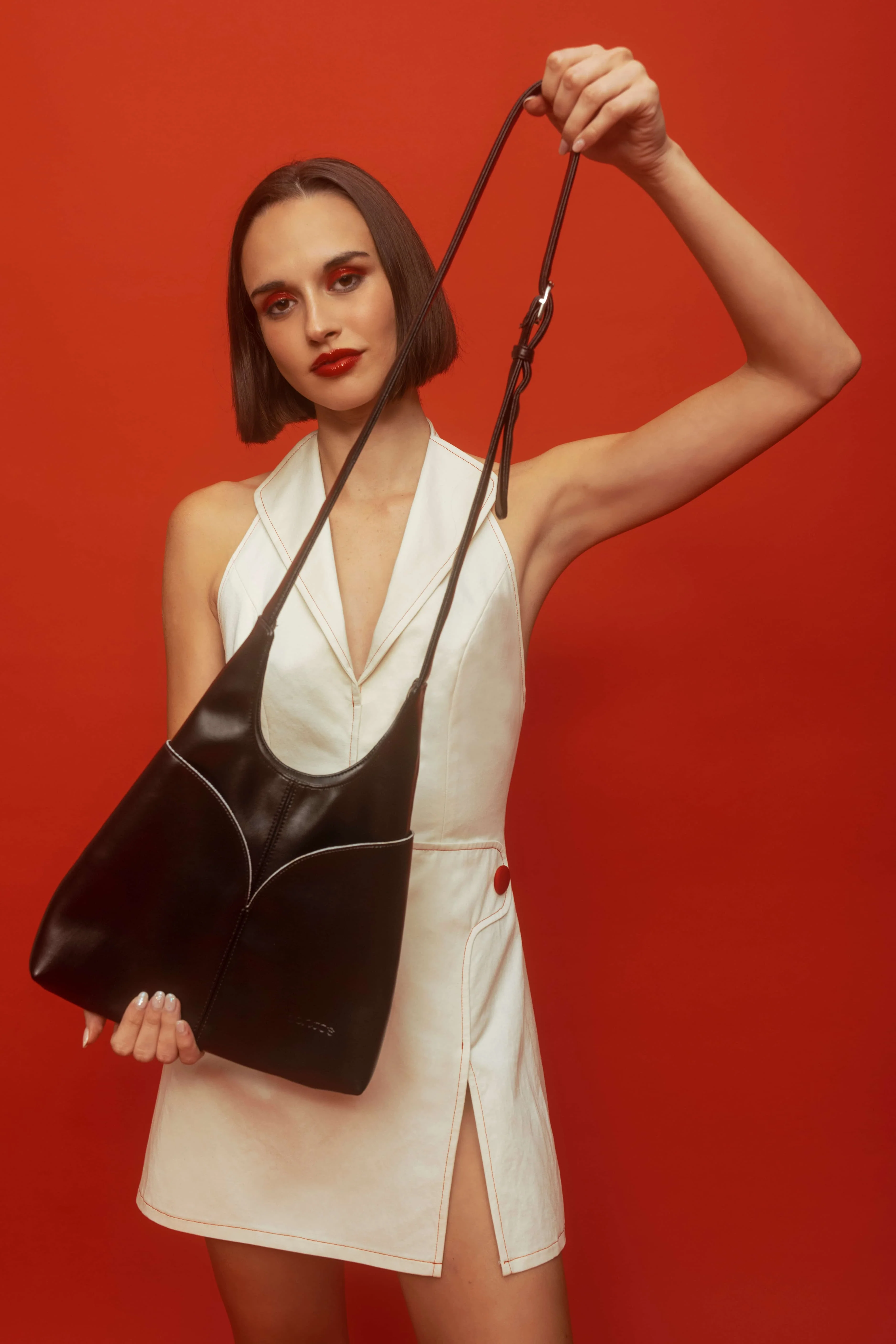 Look stunning in our Penelope Halter Dress, featuring an iconic side slit, bright red stitching around all edges, an oversized fabric covered button, and a back zip opening. Hand-made to order in the US with Eucalyptus Lyocell and Cotton.